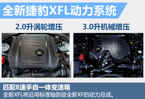 动力方面,新车分别搭载Ingenium系列的2.0升4缸涡轮增压发动机和3.0升V6机械增压发动机。其中,2.0升涡轮增压发动机的最大功率为177千瓦,峰值扭矩达到340牛米;3.0升机械增压发动机的最大功率为250千瓦,峰值扭矩达到450牛米。与发动机匹配的传动系统将是8速手自一体变速箱。