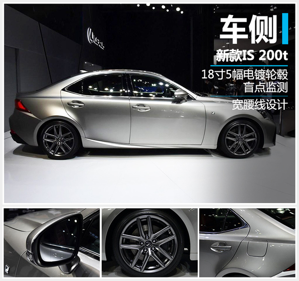 侧身的设计是最能展现汽车线条的角度,新车采用宽腰线设计,使整车看起来力量感十足,配以18寸双五幅电镀轮毂,凸显出了雷克萨斯IS运动型轿车的设计理念。在谈及车身尺寸时,雷克萨斯中国副总经理朱江表示:“新款IS作为豪华运动型车款,我们体现的是这种细节上的改变,外形更加动感有张力,但不会提供长轴距版,我们始终遵从运动型车最初始的操控质感,原汁原味动感的车型。”