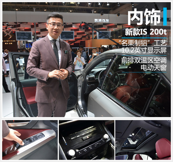 新款IS延续了雷克萨斯一贯的典雅豪华内饰风格,但在多处细节方面采用了复杂的工艺。中控屏由7寸显示屏升级为10.2寸显示屏,中控面板采用金属拉丝的材质。“车门扶手处的饰板材质采用了雷克萨斯全新的“名栗制铝”工艺打造,通过古代日本木雕技法与现代科技相结合的方式,使这种工艺考究的铝质饰板在车内多处得以呈现,彰显了雷克萨斯对细节方面设计的态度。”朱江如是说