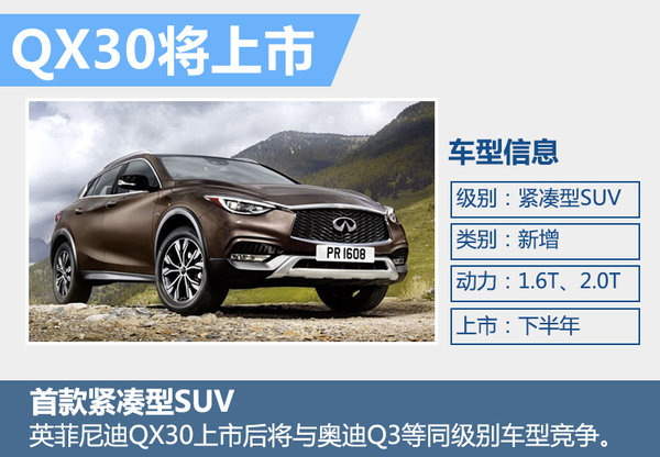 英菲尼迪2016年的“重磅之作”首款紧凑型SUV QX30已于2015年广州车展中全球首发,新车与奔驰GLA同平台打造,采用英菲尼迪“冲突美学”设计理念,造型时尚、前卫。QX30在动力方面搭载的是与Q50相同的2.0T涡轮增压发动机,满足一款紧凑型SUV对于动力输出的需求。QX30的加入使得英菲尼迪旗下SUV产品线更加完善。(图/文 网通社 王星驰)
