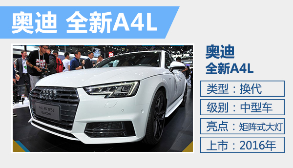 奥迪全新A4L基于第二代MLB Evo模块化平台打造,外观设计更加运动化,整体轮廓与现款变化不大,但车身线条更加硬朗,棱角分明,更加突出运动感。全新A4L还使用了奥迪最新的矩阵式LED大灯。新车在北京车展首次亮相,搭载全新的2.0T涡轮增压引擎。此外,全新国产A4L将针对轴距进行加长。
