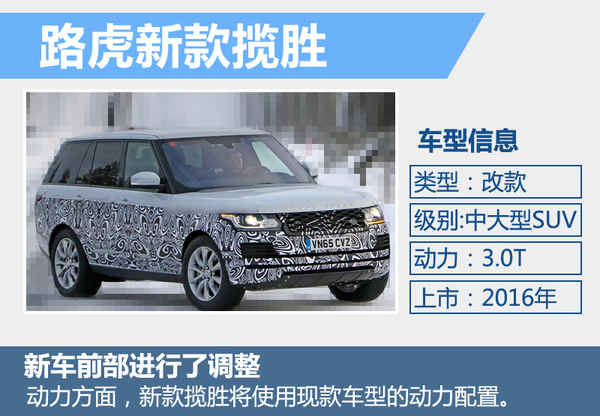 从照片中看新车主要对前脸风格进行了换新,使用了全新蜂窝状进气隔栅,头灯内部则采用了全新照明元件,侧进气口位置进行调整后,整体来看,新款揽胜的运动气息更加浓厚。动力方面,新款揽胜将使用现款车型的动力配置,搭载一款排量为3.0升的V6机械增压发动机,传动匹配8速手自一体变速箱。