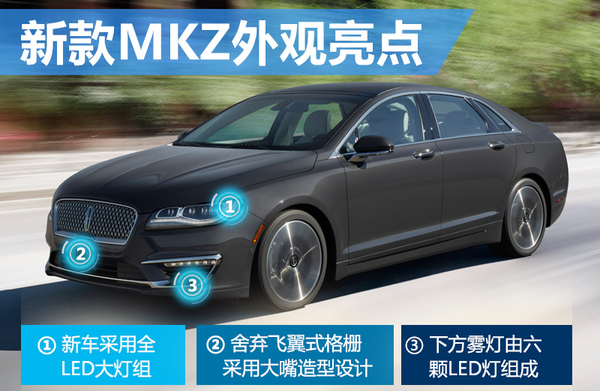 新款MKZ最大变化来自于前脸部分。新车舍弃现款飞翼式格栅设计,采用Continental大嘴式格栅,其中网格造型和林肯十字徽标十分相似。此外,新车包括前大灯、转向灯、日间行车灯和雾灯,均采用LED光源,相比传统卤素大灯和氙气大灯,LED大灯组光照效果更强,夜间行驶时提升驾驶员视野范围。