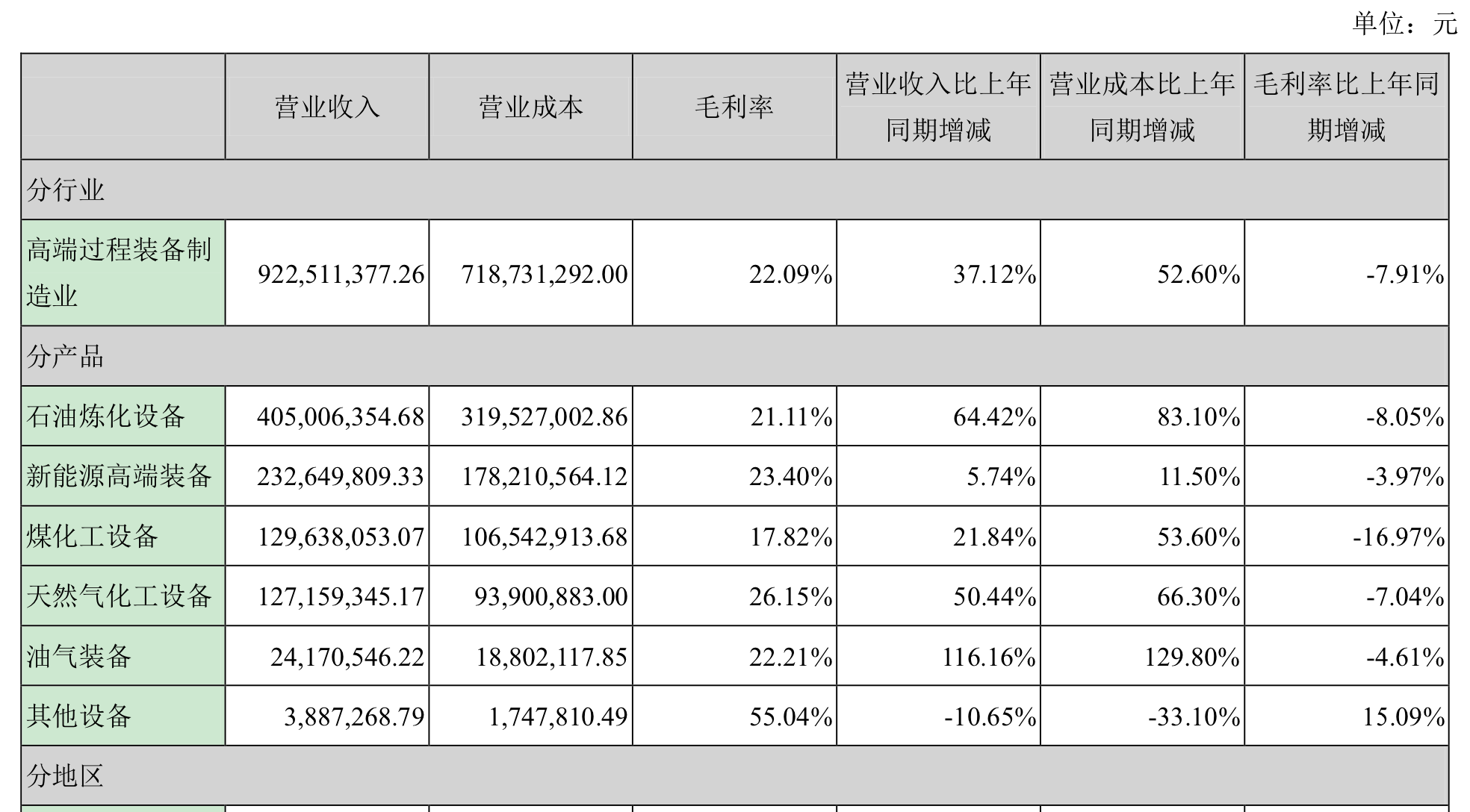 不过需要指出的是,关于毛利率这块,2021年科新机电的产品却有不同程度的下滑。其中,石油炼化设备毛利率下滑了8.05%,新能源高端装备的毛利率下滑了3.97%,煤化工设备下滑了16.97%,天然气化工设备下滑了7.04%,油气装备下滑了4.61%。