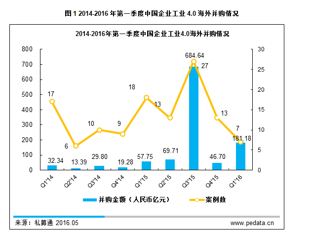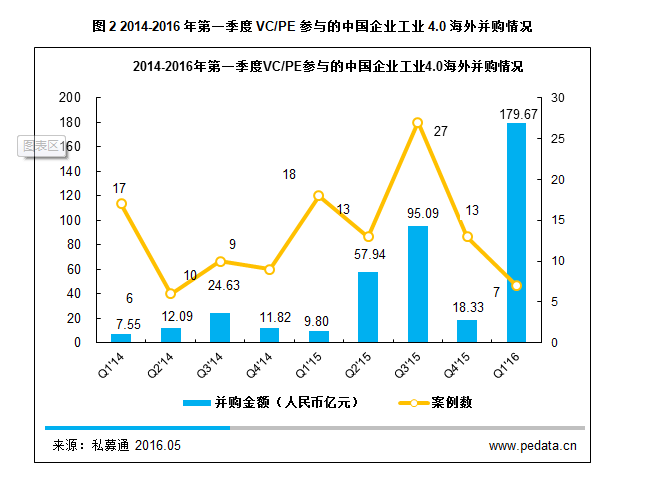 2016年第一季度发生海外并购合计41起,涉及交易金额349.24亿元,其中工业4.0类并购发生案例7起,涉及交易金额181.18亿元。