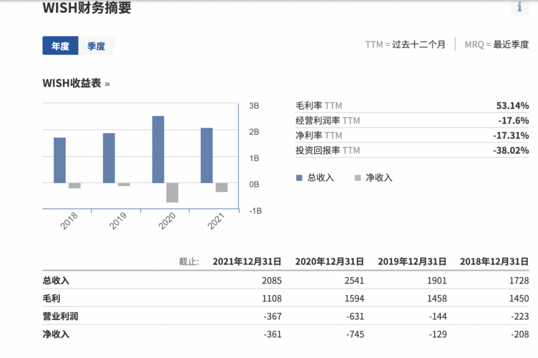 财报显示,2021年营收20.86亿美元,同比下降18%,其中仅有物流收入保持增长,这是Wish推出的新业务;净亏损3.61亿美元,同比2020年的7.45亿美元略有收窄,但这是建立在减少广告支出、节省成本的基础之上。