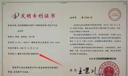 根据客服给出的专利证书显示,对于“成纤维细胞生长因子-2结构类似物 其生产方法及应用”这一发明专利,专利权人的确为暨南大学生物工程研究所。