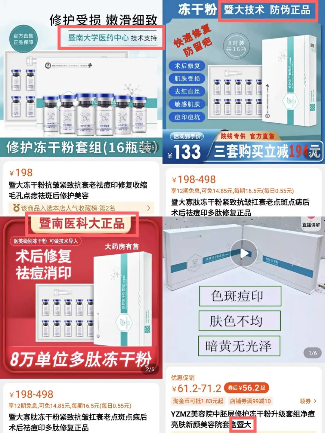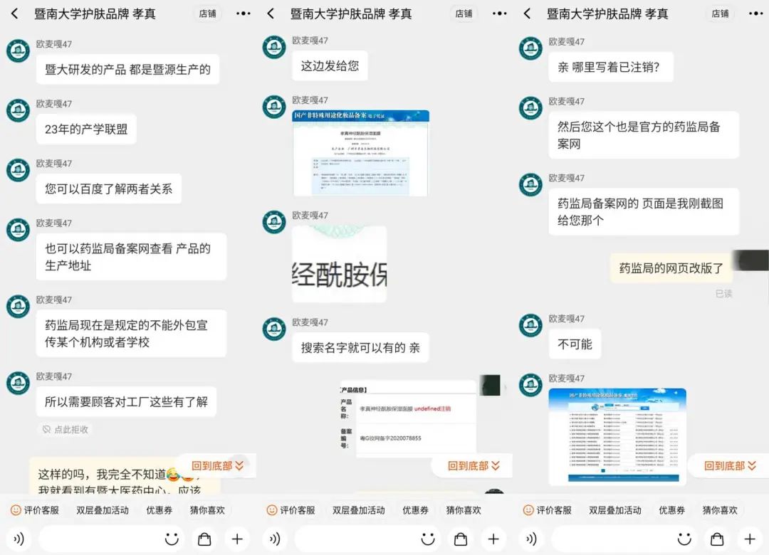 品牌冻美人(淘宝店铺:暨大本部美自花城)客服则表示,“很多写着暨大名称的都是化妆品工厂假扮的,只有暨大生工所(广州暨南大学生物工程研究所)才是真正的暨大,冻干粉唯一国家研发单位”。