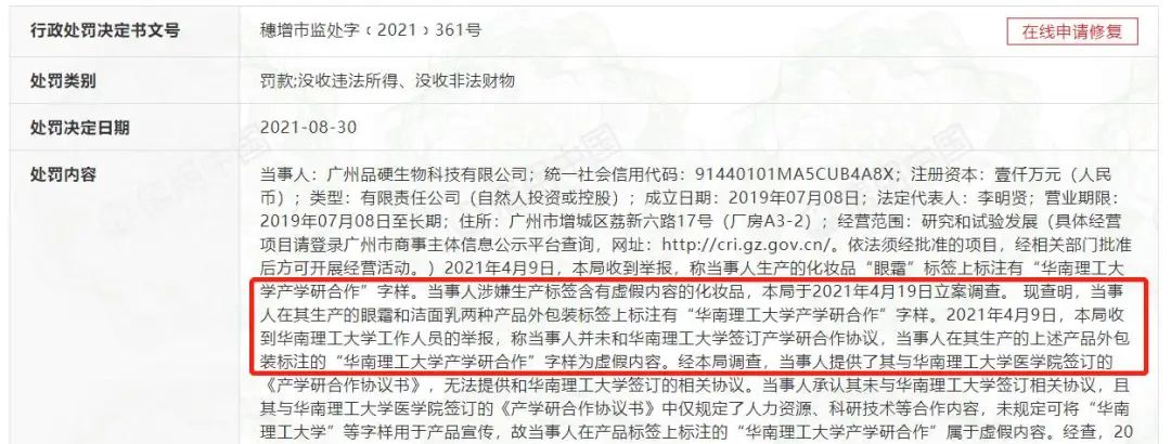 据信用中国公布的行政处罚文书内容显示,广州品硬与华南理工大学医学院签订了《产学研合作协议书》,但其中只规定了人力资源、科研技术等合作内容,并没有规定可以将“华南理工大学”等字样用于产品宣传。但是,广州品硬在其生产的产品外包装上标注了“华南理工大学产学研合作”字样,属于虚假内容。