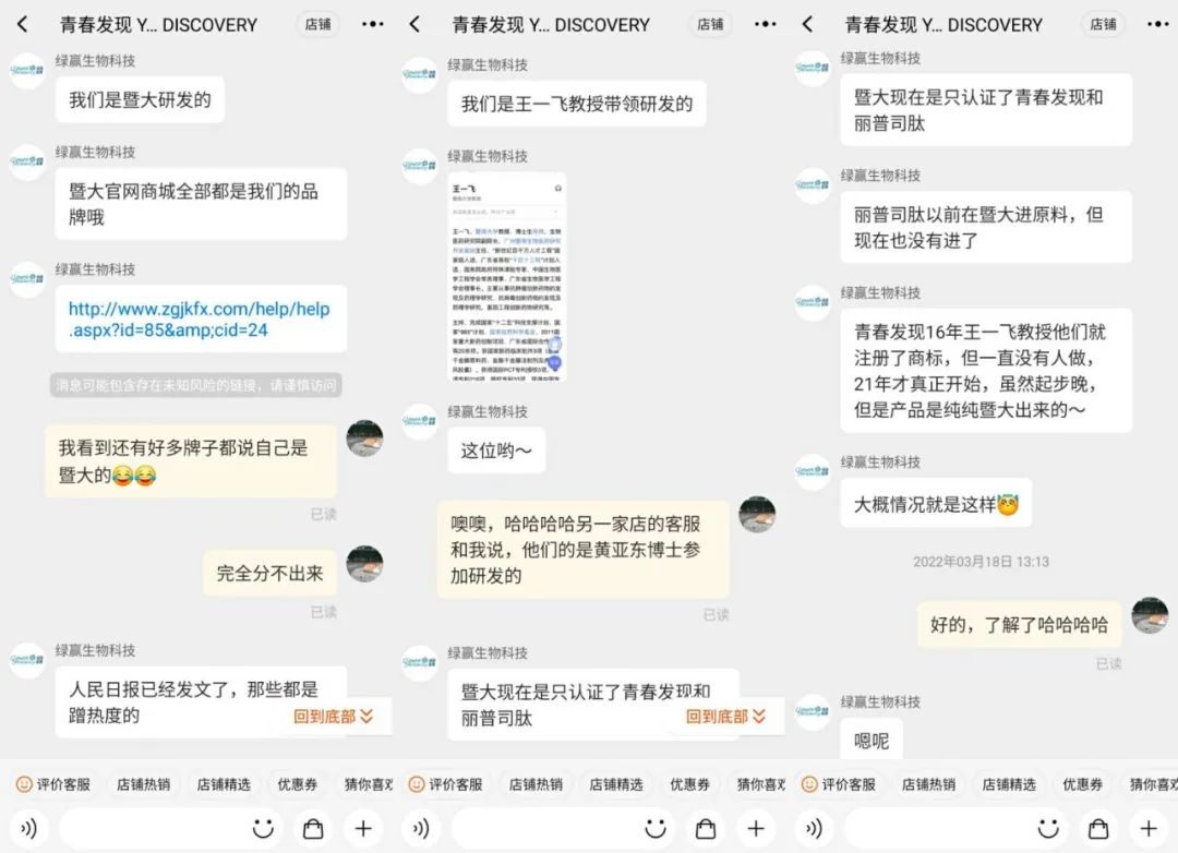 据店铺客服表示,青春发现冻干粉由暨南大学王一飞教授带领研发,并出示相关文章的截图表示,目前暨南大学官方只认证了青春发现和丽普司肽两个品牌,且丽普司肽已经不在暨南大学进购原料。