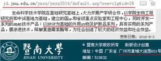 另外,客服还发送给记者两张照片,其一展示的是网页报道中提及了“生命科学技术学院…以学院生物工程研究所和中试基地为基础……开发了……以BFGF为基础的外用药物及护肤品系列”等语句,另一展示的是该店暨大冻干粉包装盒上的“广州(暨南)生物医药研究开发基地技术支持”字样。