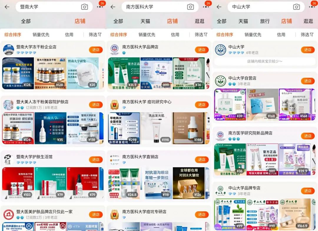 但是,某些不知名的化妆品公司,自作聪明的选择了一条看似更快、成本更低的与高校“合作”的路径,他们直接将一些全国知名高校放在产品名称中,比如“暨大冻干粉”“华南理工大学眼霜”“南方医科大学视黄醇精华”等,在电商平台上进行销售,甚至在小范围内有些泛滥之势。