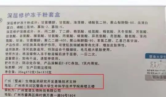 青春发现品牌(淘宝店铺:青春发现YOUTH DISCOVERY)在其冻干粉产品的详情页中写到,该冻干粉由暨南生物医药研发基地开发。据悉,暨南生物医药研发基地由暨南大学和广州市科技局共建,是暨南大学的官方科研单位。