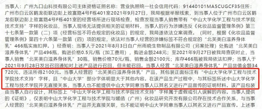 九口山科技从广州雨晓生物制品有限公司进购的“北芙美白滋养身体乳”,包装正面标注有“中山大学化学工程与技术学院技术支持”字样,而且“中山大学”部分字体明显大于其他内容。