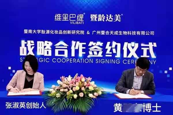 客服还出示了一张战略合作签约仪式的照片,涉及暨南大学肽源化妆品创新研究院和广州暨合天成生物科技有限公司、维里巴缇和暨龄达美两个品牌,签约人为张淑英创始人和黄博士。