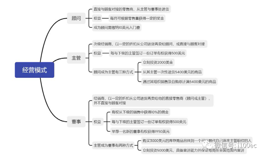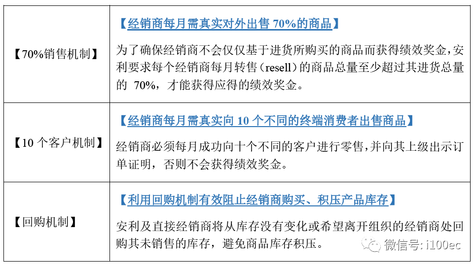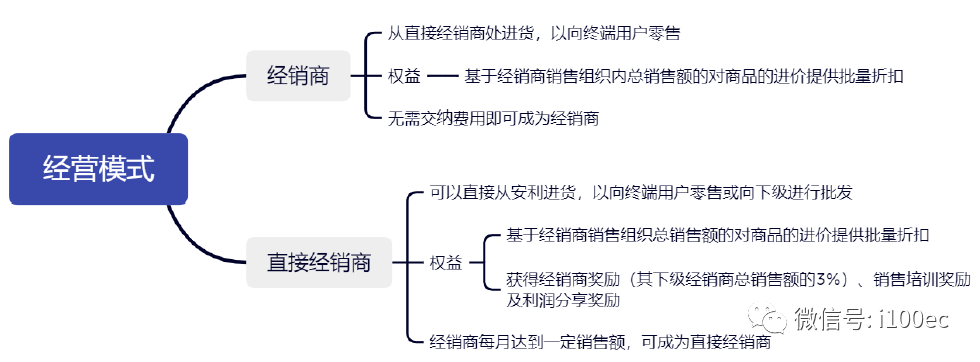 安利案确定了多层级直销组织不构成传销的豁免判断标准。众所周知安利是一家制造、分销及销售清洁、个人护理产品以及食品补充剂等产品的公司,拥有超过300,000 家独立经销商直接向消费者进行挨家挨户的销售。具体运营方式如下图所示: