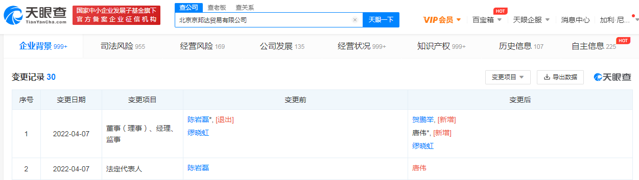 天眼查App显示,4月7日,京东物流关联公司北京京邦达贸易有限公司发生工商变更,陈岩磊不再担任法定代表人、执行董事及经理职位,由唐伟接替。该公司成立于2012年8月,注册资本10亿人民币,由西安京东信成信息技术有限公司全资持股。