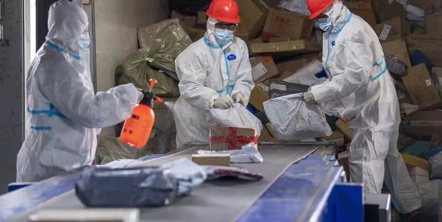 到了网点之后,一边进行分拣的工作,一边有动雾化消毒装置对快递进行消杀,快递员将快递送到小区相应地点之后,物业、居委会或者志愿者会再次对快递进行消杀。等到快递员完成派送返回网点,车辆、人还会进行消毒。