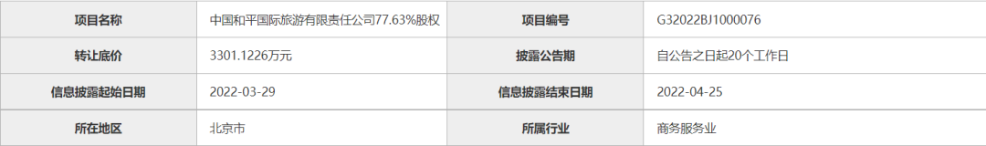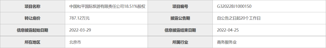 实际上,这已经不是和平国旅第一次被挂在北交所出售股份。今年2月,北交所发布了一条产权转让的预披露信息,标的名称为“中国和平国际旅行社有限责任公司77.63%股权”,标的企业类型为国有控股,转让方为北京首钢实业集团有限公司。一个多月过去,这家老牌旅行社竟然仍旧无人问津。