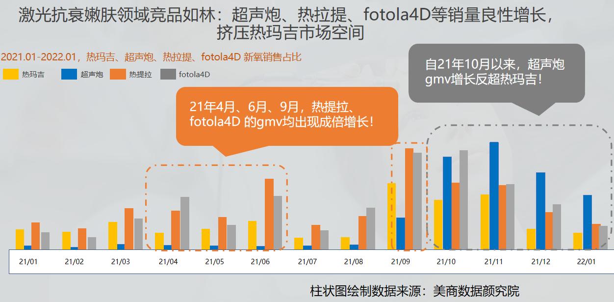 相对于热玛吉高昂的价格和对疼痛耐受力的较高要求,热拉提PLUS、Fotona 4D也是很多求美者的心头爱,特别是Fotona 4D还有“改善、提亮肤色”的附加效果,在热玛吉五代产能不足,求美者被“抗衰等不起”的营销口号教育下,爆冷出圈。