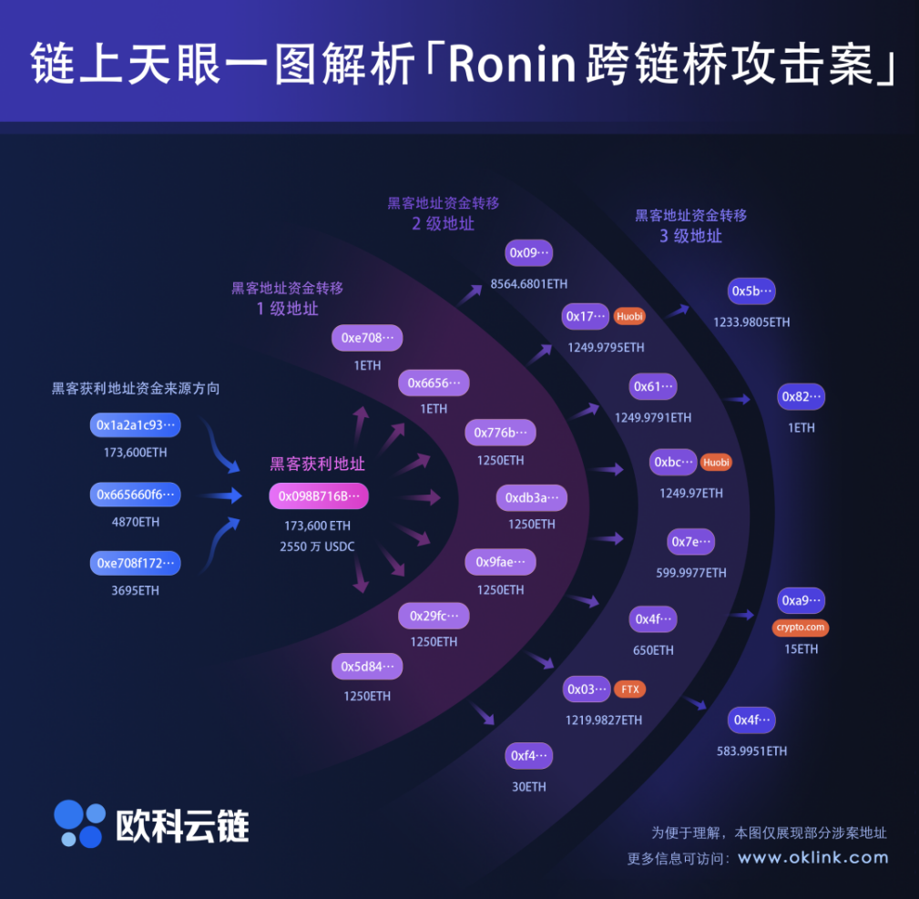 虽然Ronin官网以新一轮融资来缓解压力,但损失的资金并未被追回。据欧科云链,截止目前,黑客获利地址已被欧科云链链上天眼团队打上“Hack“标签,成为欧科云链2亿地址标签库之一,为日后的案件追溯提供底层基础。由于链上地址的透明性,黑客地址往往不会轻易转帐,所以不排除最后返还的可能性。