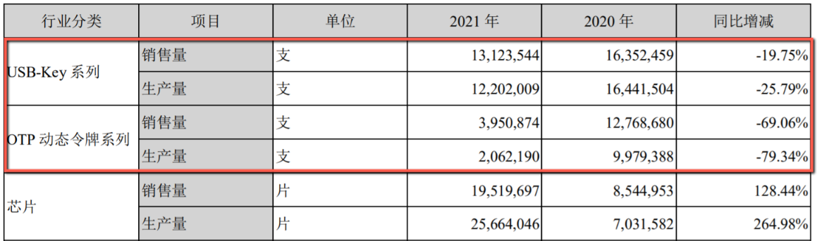银行等对信息安全领域要求较高的领域是USB Key产品的主要需求方,但现阶段需求下降较快,加之市场过度竞争,售价也呈下降趋势。数据显示,飞天诚信的USB Key系列和OTP动态令牌系列2021年均大幅度下滑,可见银行客户需求也出现了较大幅度下降。其中,OTP动态令牌系列下滑尤其明显。无论在生产还是销售数量上都较2020年下降7成有余。