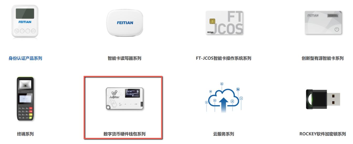 从飞天诚信官网可以看到,数字货币硬件钱包属于公司八大产品系列之一。其中,JuBiter是为数字货币打造的专属品牌,旗下有JuBiter Blade和JuBiter Lite两款成熟产品,前者是蓝牙无线硬件钱包而后者是NFC非接卡式硬件钱包产品,产品目前支持于BTC、ETC、ETH等主流数字货币。