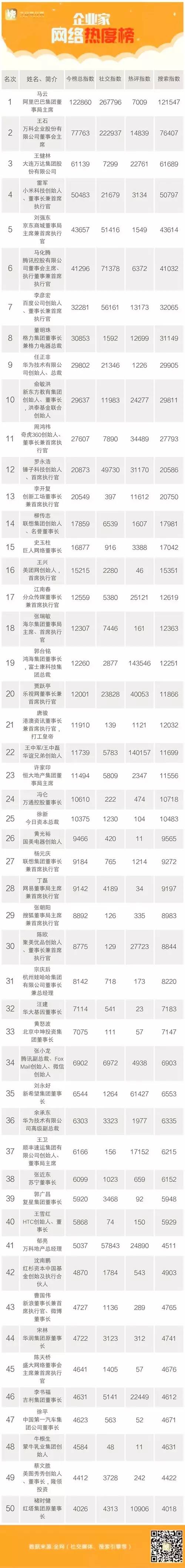 反观其他人,马云、马化腾、刘强东占据了本周企业家网红榜前六位的三个名额,他们都是曾随习近平访美的当红企业家,在控制自己一手创造的企业方面,这些后辈几乎都可以做王石的老师。