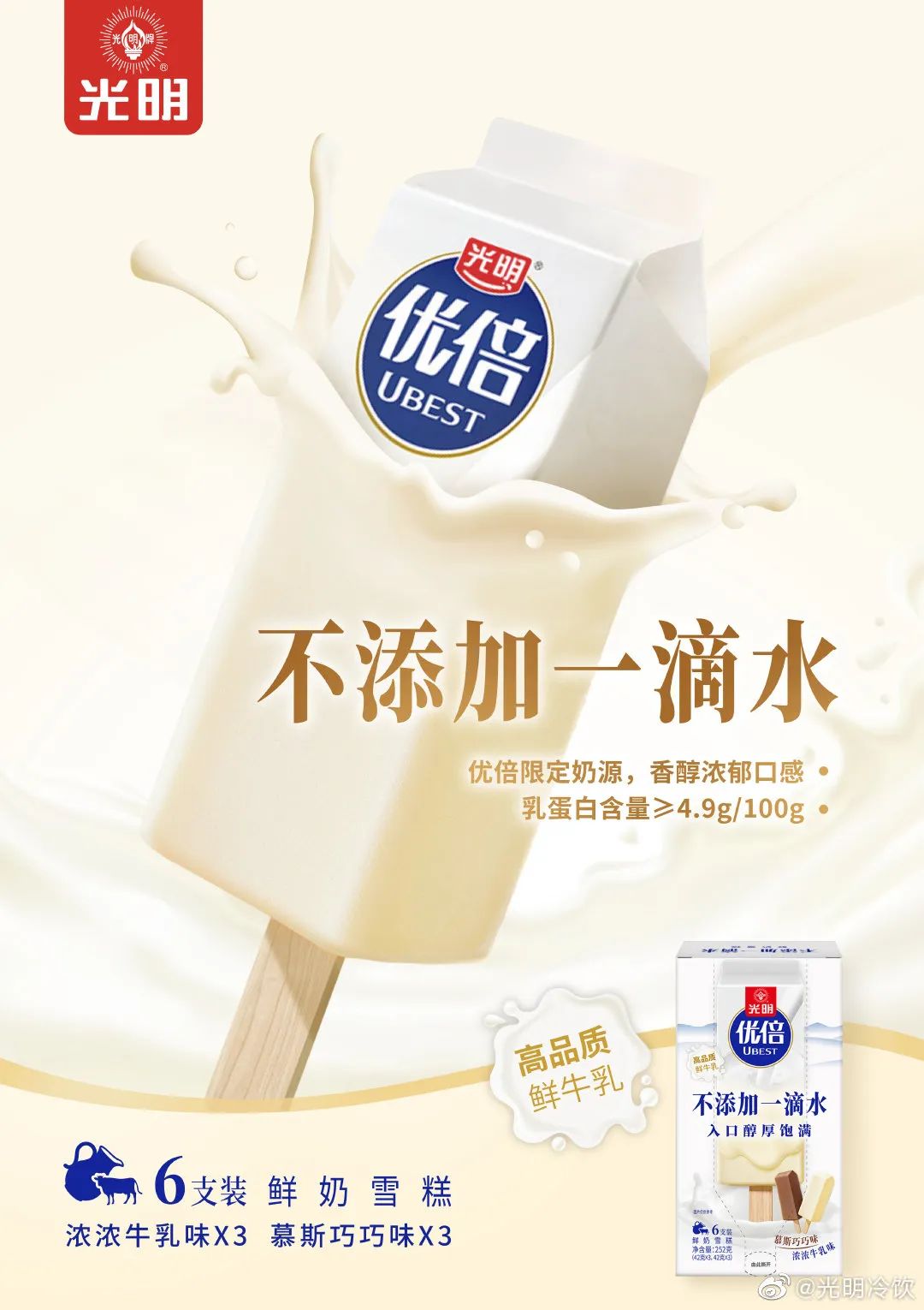 光明则用旗下优倍鲜奶的口碑背书,推出「优倍鲜奶冰淇淋」,配料表首位“鲜牛乳≥60%”。
