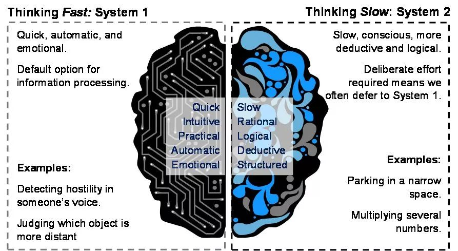 拉踩一下,人类在思考(也是一种知识计算)时就十分节省能耗,心理学家卡尼曼在《思考,快与慢》中就提出,人脑既可以通过系统2进行较慢的理性思考,也可以经由系统1,基于已经内化的知识,实现无意识的、近似于肌肉记忆的快速运算,大脑能量消耗极少。