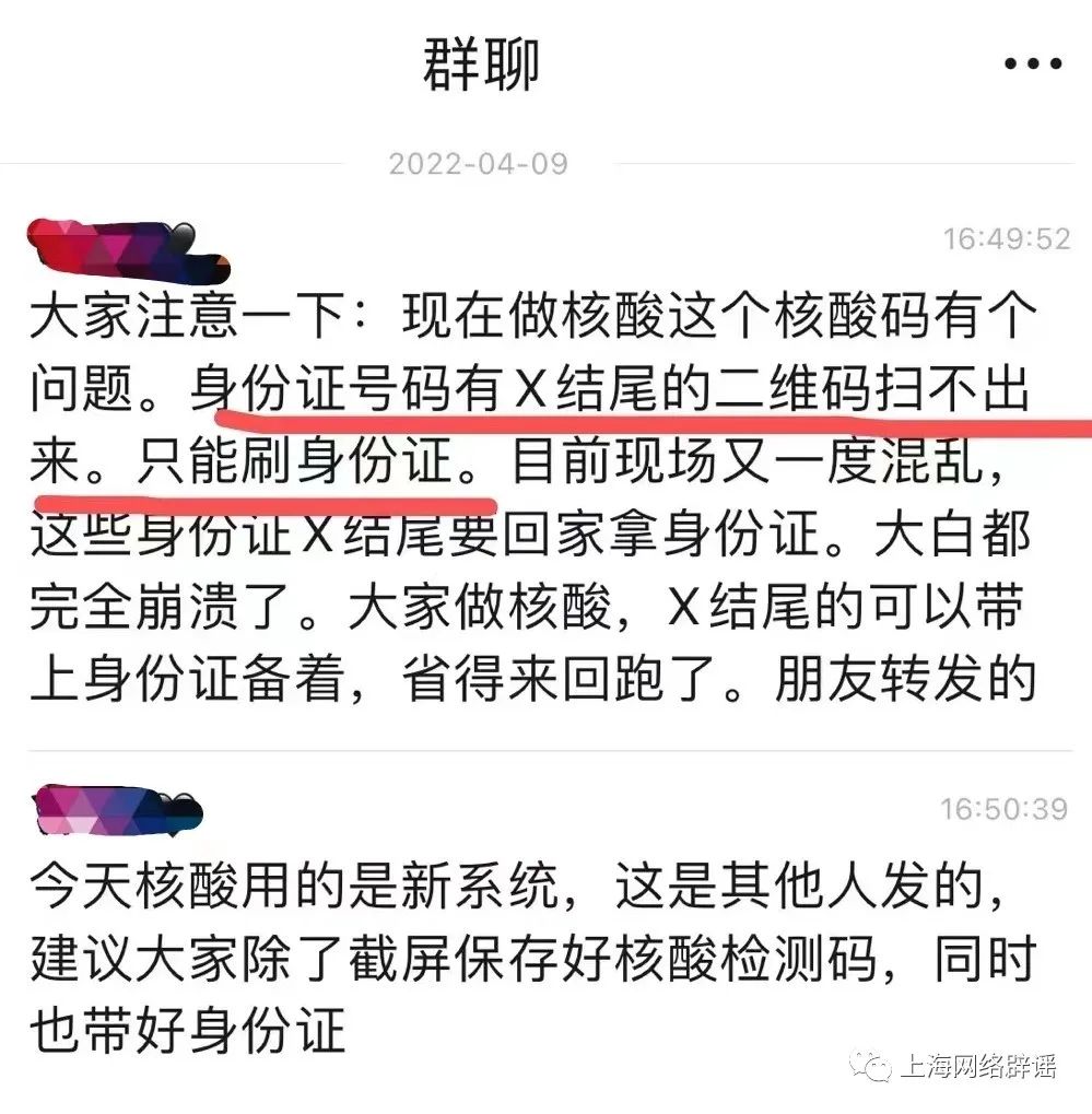 同时,上海辟谣平台从上海市网信办获悉,经调查,最初发布“身份证号码有‘X’结尾的二维码扫不出来”文本的是网友黄某,其在小区群传播了该文本,并称“我朋友说的”;而截图中的发言人员为一名基层干部,因其在基层现场工作,看到此条消息后便仓促转发,来不及核实真伪,属于以讹传讹。
