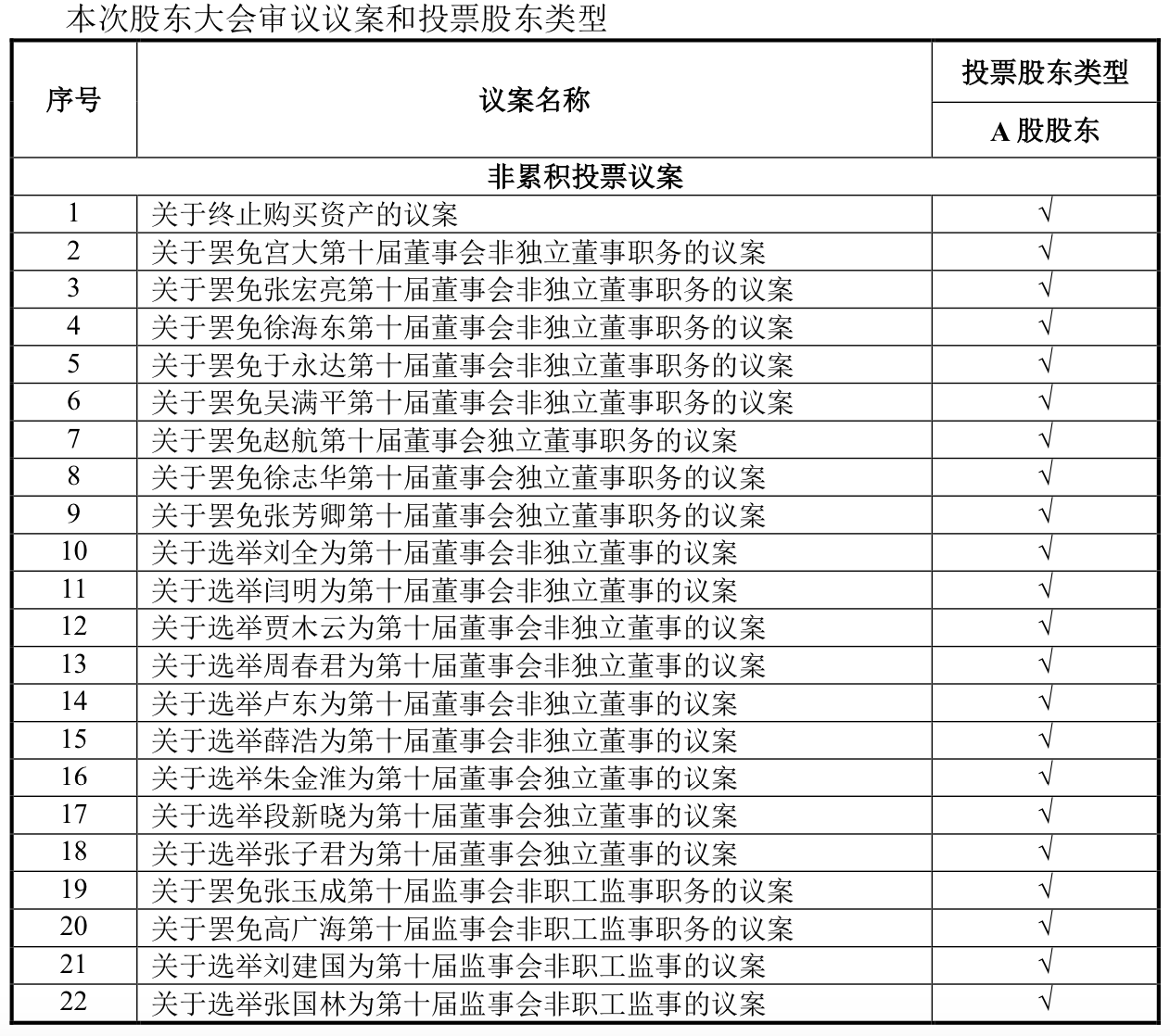 此次股东大会审议的议案共计22项,其一议案是终止购买资产,第二至第九议案是罢免宫大、张宏亮、徐海东、于永达、吴满平、赵航、徐志华、张芳卿这8名现任第十届董事成员,另外第十九和二十议案,是罢免张玉成、高广海两名监事,剩下的议案则是选举刘全、闫明、贾木云、周春君、卢东、薛浩为非独立董事,选举朱金淮、段新晓、张子君为独立董事,选举刘建国、张国林为监事。