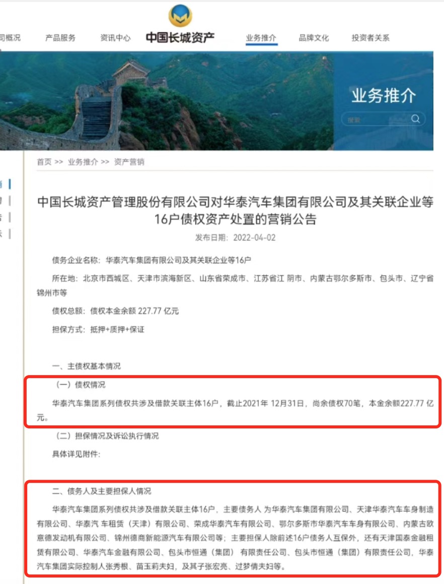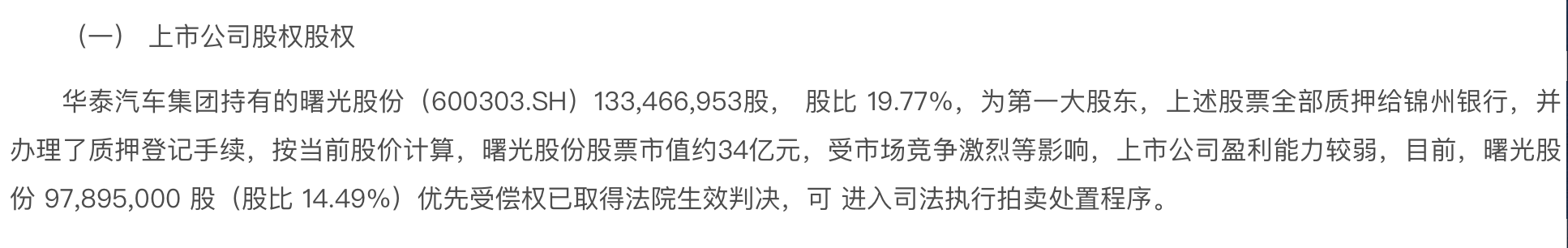 据长城资管给出的资产处置相关公告,华泰汽车集团及其关联企业共16户,截止2021年12月31日,尚余债权70笔,本金余额227.77亿元。在资产描述中,提及目前华泰汽车集团持有的曙光股份19.77%,全部质押个了锦州银行,并办理了质押登记手续,按当前股价计算,市值约为34亿元,受市场竞争激烈等影响,上市公司盈利能力较弱,目前曙光股份的14.49%筹码优先受偿权已取得法院生效判决,可进入司法执行拍卖处置程序。