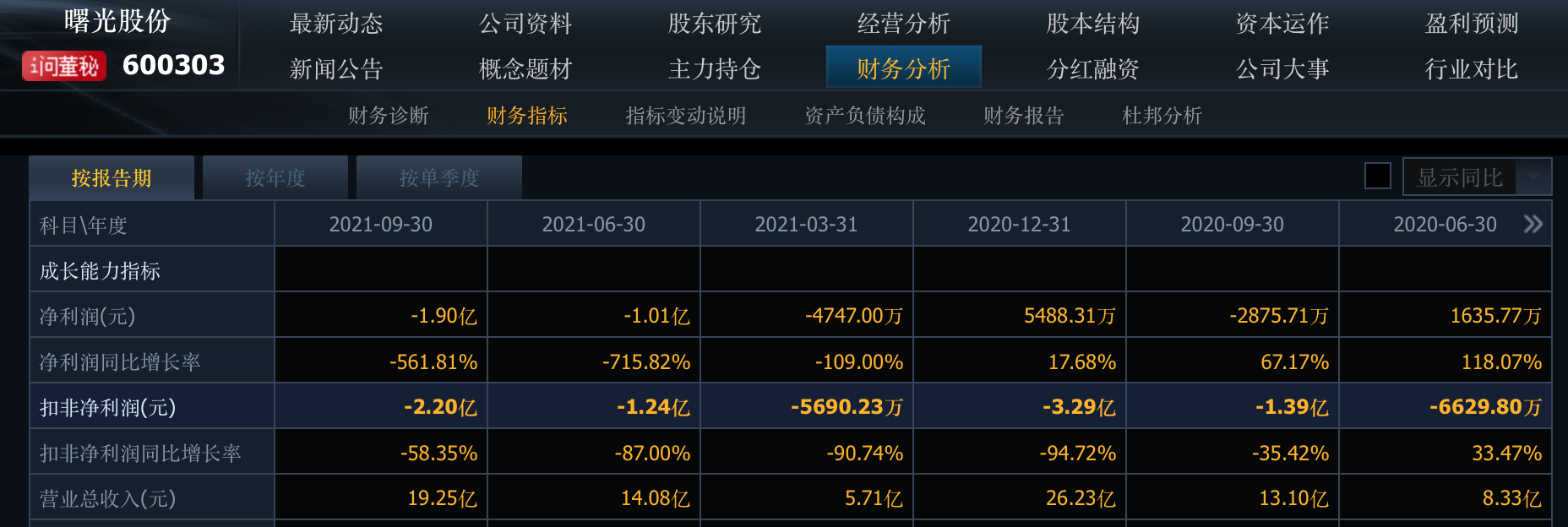 财务数据显示,曙光股份扣非净利润自2012年为一直为负值,2020年为-3.29亿元,2021年前三季度为-2.2亿元,同比增长率为-58.35%,2021年前三季度的净利润为-1.9亿元,同比下滑了561.81%。