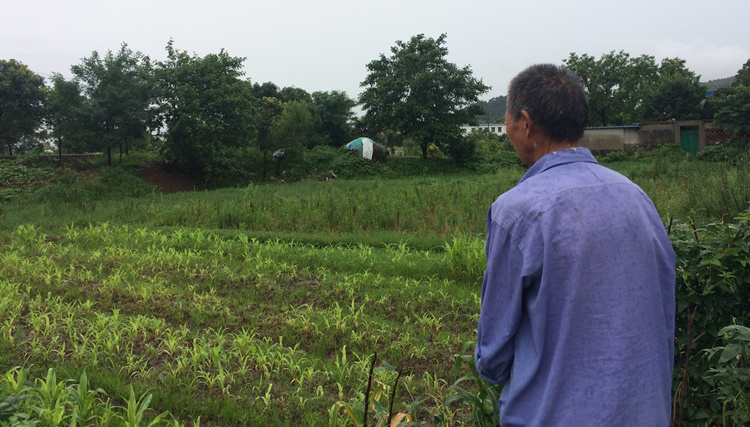 同村71岁的娄尤伯无奈地望着他的庄稼地,4分菜田里种着用于自家食用的粮食——玉米和豆角。