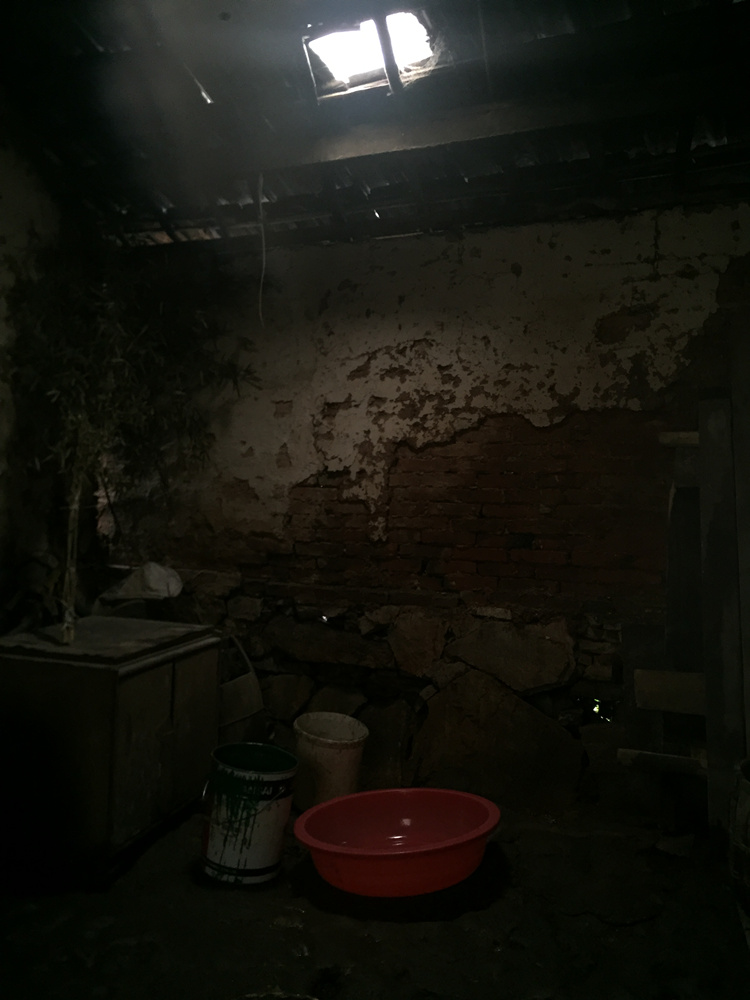 在暴雨来前,他已经修整了屋顶的瓦片,在房梁上架起塑料薄膜,尽管如此,大雨仍然冲坏了一间房屋的几片瓦,水不间断地从屋顶漏下。