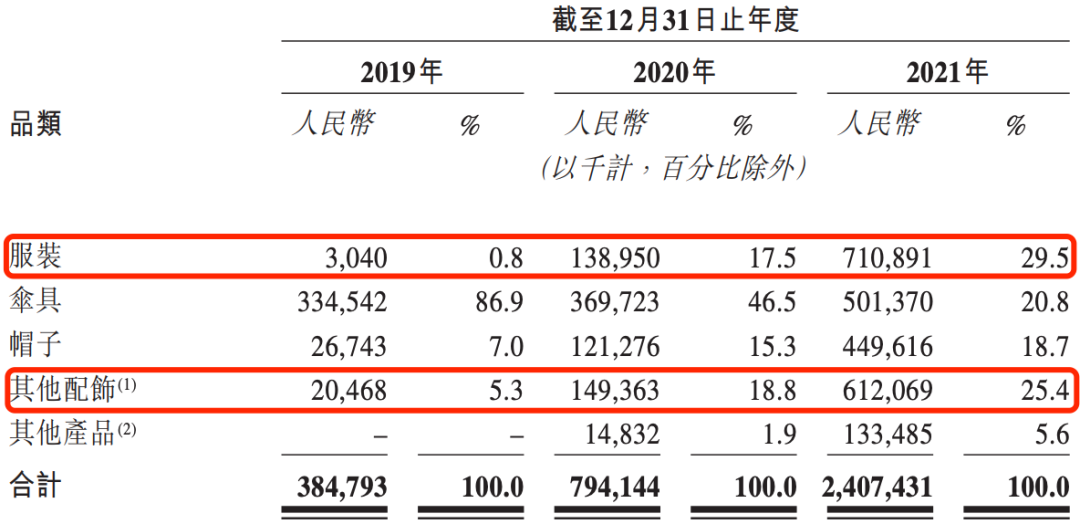 据其招股书显示,在越来越多新品推出后,蕉下原本主打的防晒伞具品类营收占比一路下滑,从2019年的86.9%降至2021年的20.8%。反而是2019年营收占比仅有0.8%的服装品类(以防晒系列和保暖系列为主),在2021年成了第一支柱品类,营收占比达到29.5%。而配饰系列(包括墨鏡、口罩、披肩、袖套及手套等)的营收占比从2019年的5.3%升为2021年的25.4%,成为第二支柱品类。