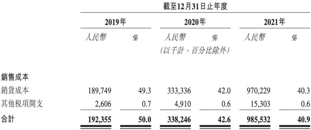 于2019年、2020年及2021年,蕉下将所有生产外包给予合约制造商,合约制造商以销定产。这也为蕉下带来了1.92亿元、3.38亿元及9.86亿元的销货成本,分别占总收入的49.3%、42%及40.3%,整体成下滑趋势,但近两年已经稳定在了四成左右。