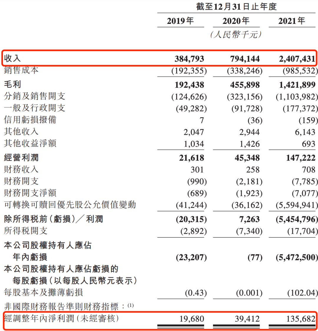 2019年-2021年,蕉下的营收分别为3.8亿元、7.9亿元和24.1亿元,年复合增长率为150.1%。同期,如果扣除可转换可赎回优先股的公允价值变动,蕉下经调整净利润分别为1968万元、3941万元及1.4亿元,年复合增长率为162.6%,盈利能力持续提高。