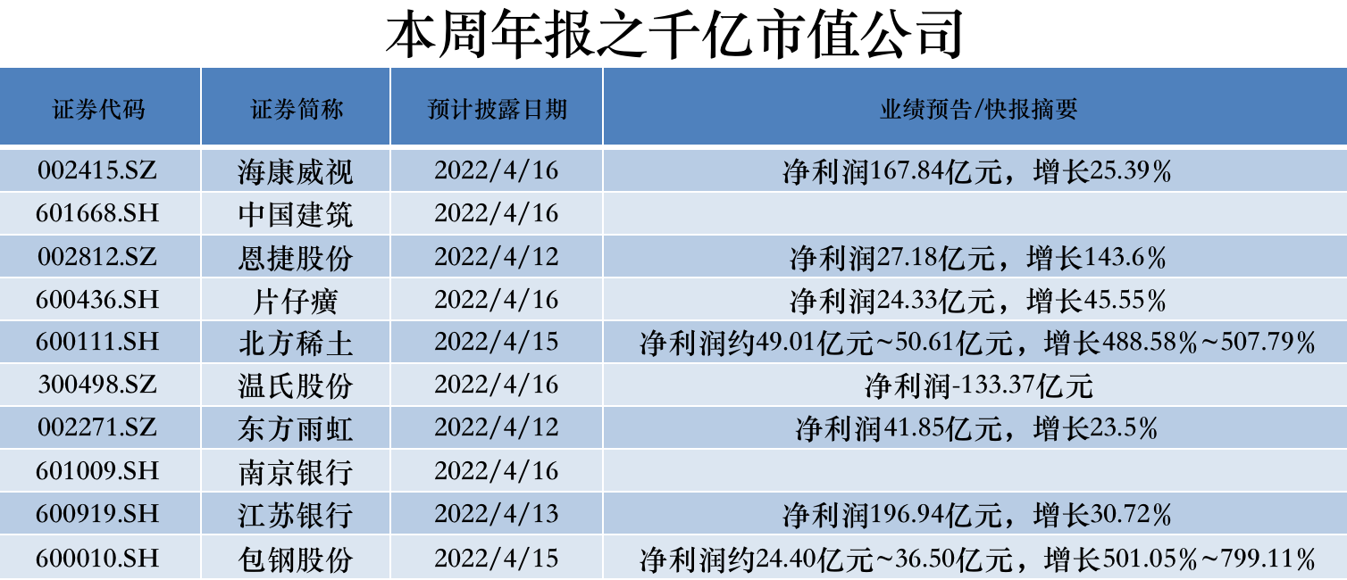 本周有10家市值过千亿元的公司将披露年报,其中8家公司已提前披露了业绩预告或快报,除温氏股份(300498.SZ)一家亏损外,其余均录得净利润增长。