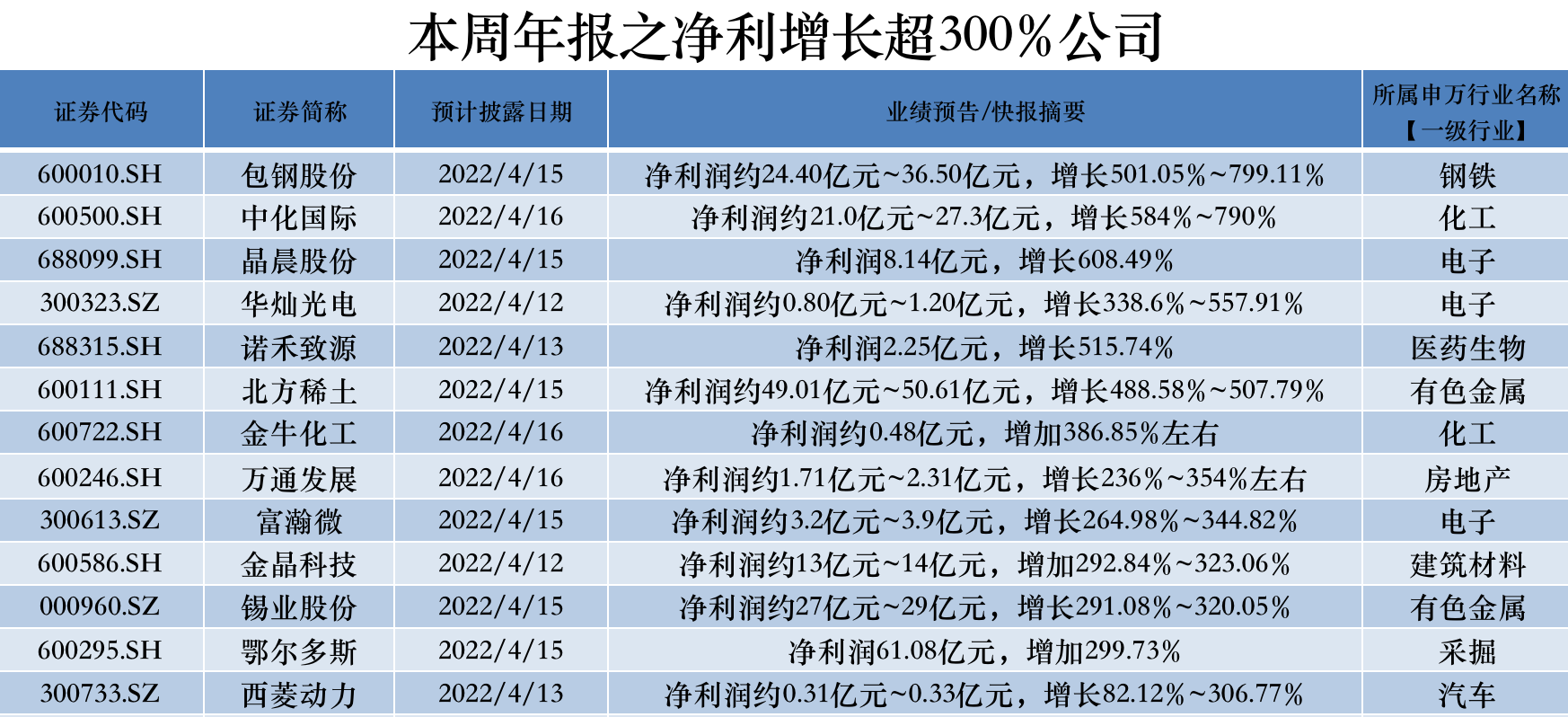 剔除扭亏公司,本周将披露年报的公司中预计净利润增长最高翻倍的公司共有58家,其中北方稀土、包钢股份、中化国际(600500.SH)、 晶晨股份(688099.SH) 、华灿光电(300323.SZ)、诺禾致源(688315.SH)6家公司净利增幅超5倍。