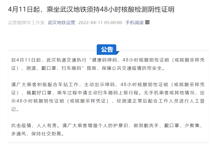 自4月11日起,武汉轨道交通执行“健康码绿码、48小时核酸阴性证明(或核酸采样凭证)、测温、戴口罩、扫车厢码”措施,保障公共交通疫情防控安全。