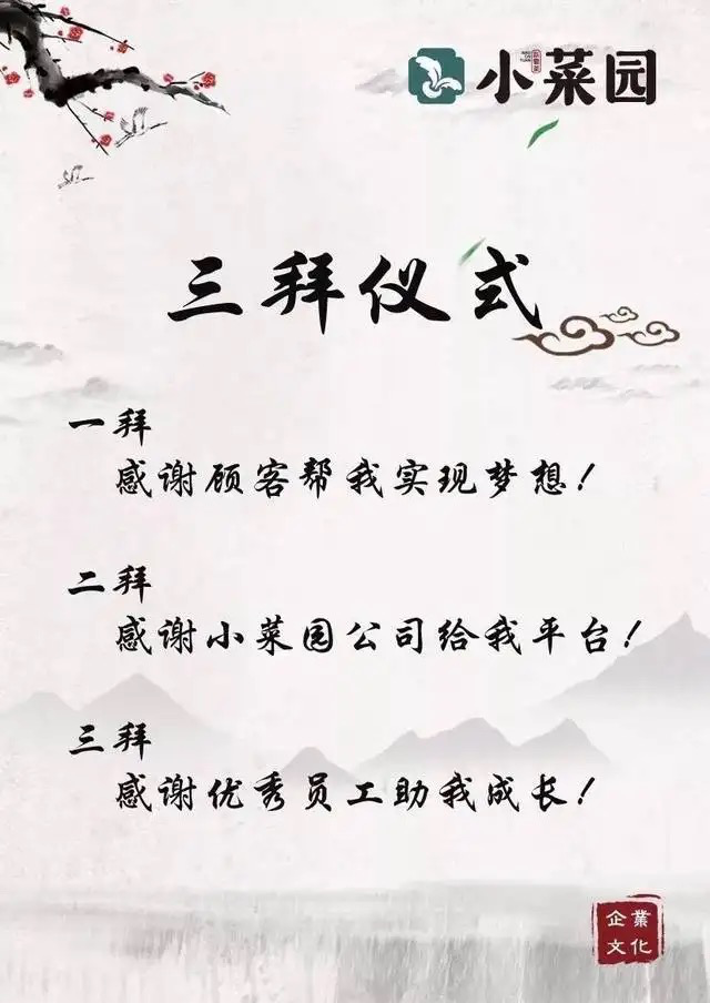 随后内参君搜到了一张小菜园三拜仪式的图片,阐述着对顾客、公司与公司伙伴的感恩之情。或许在这个“围城”内,有股神秘的力量。