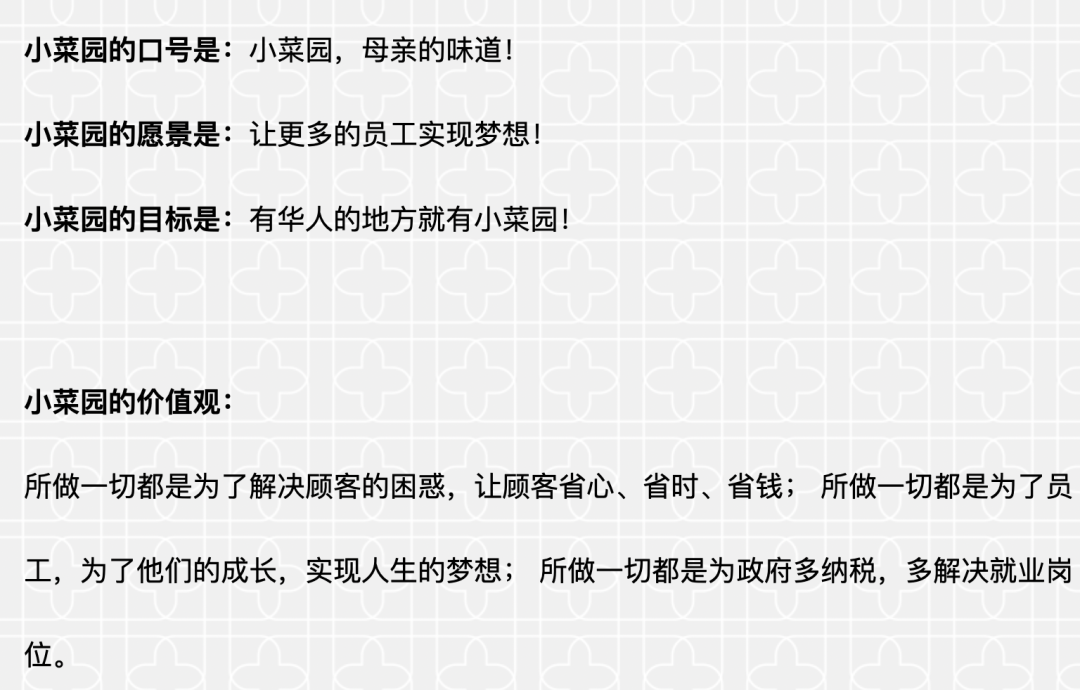 与推进中餐标准化进程的远大愿景不同,小菜园的企业愿景非常质朴。在其官网上,我们能读到这样的企业文化: