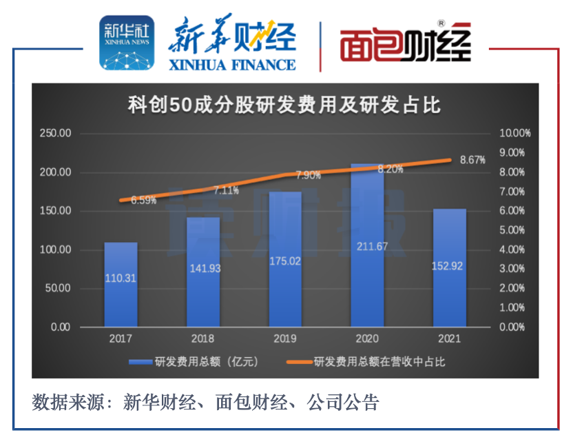 截至4月7日收盘,科创50成分股共有24只股票公布2021年报。数据显示,24只个股研发费用总额为152.92亿元,较2020年增加了24.82亿元,研发费用占比达8.67%,但同比下降0.8个百分点。