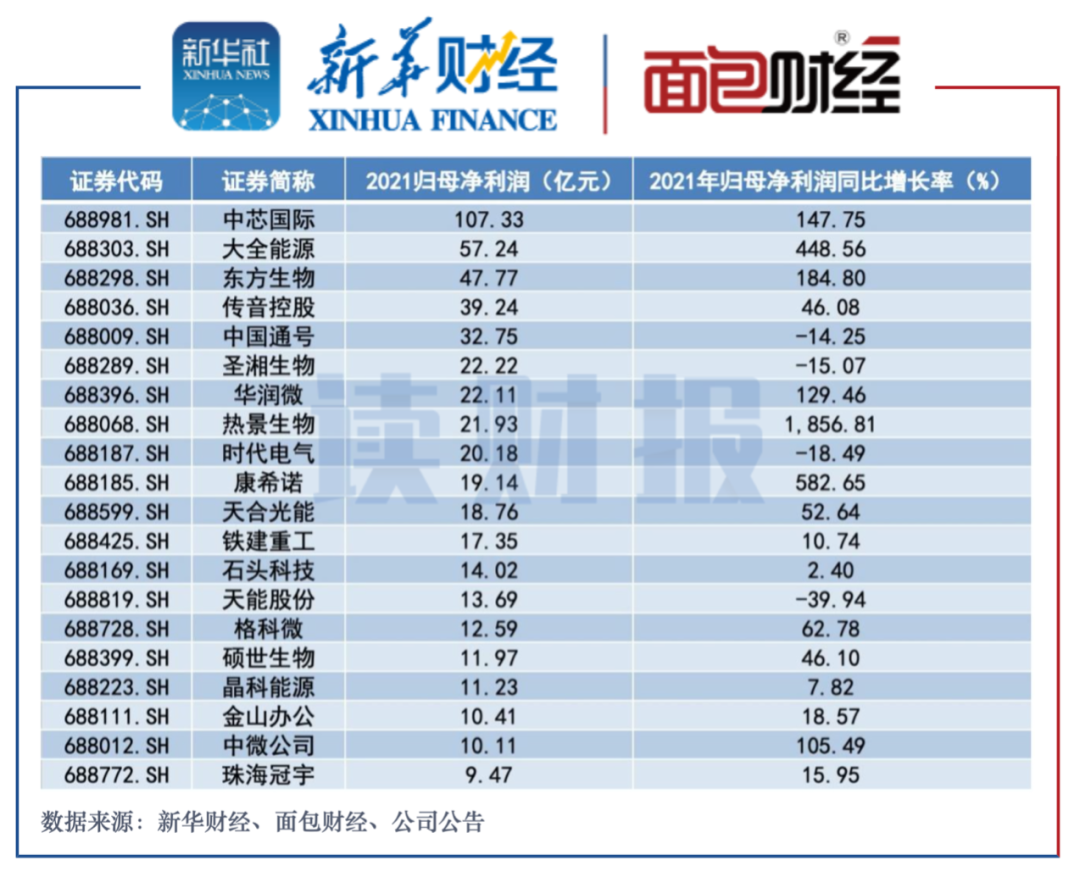 中芯国际、大全能源、东方生物位列利润榜前三,百济神州成“亏损王”