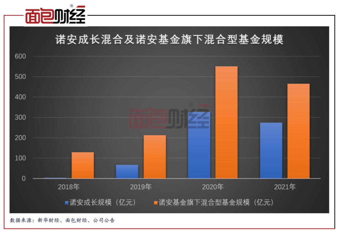 2021年末,诺安基金非货币型产品的管理规模为686.52亿元,其中混合型基金的资产净值约为465.70亿元。混合型产品中,蔡嵩松的管理规模超过300亿元。由此可见,蔡嵩松一个人撑起了诺安基金非货币型产品的半边天。