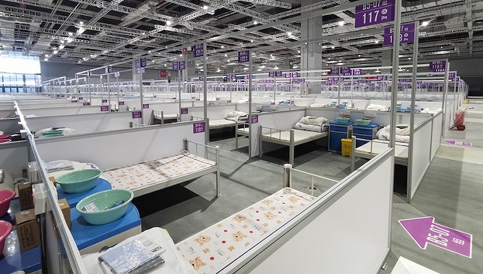 在收的环节,要求做到统一调度、先收后分。全市统一统筹调度,根据可收治床位情况转运感染者,转运车辆到达方舱医院后,先收后登记分诊。