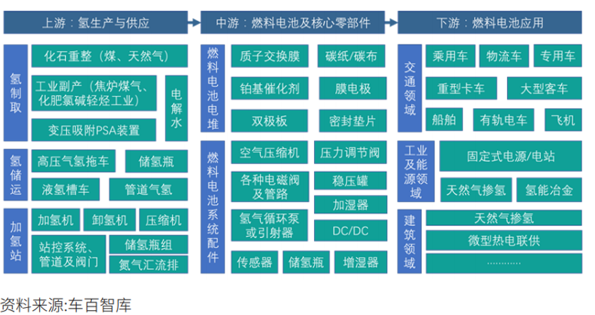 其中,上游原材料包括铝材、钢材、碳纤维和树脂等,零部件包括各种金属阀门和各类传感器;中游生产制造设备和制造工艺等;下游则是在燃料汽车、氢气运输罐、加氢站等场景上的应用。