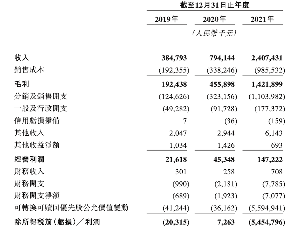 蕉下招股书披露,2019年-2021年的营收分别为3.8亿元、7.9亿元、24.1亿元,年复合增长率为150.1%。2019年-2021年毛利润分别为1.9亿元、4.6亿元和14.2亿元,毛利率分别为50.0%、57.4%和59.1%,逐年持续提升。2021年经调整净利润为1.4亿元,近三年的复合增长率达到162.6%。